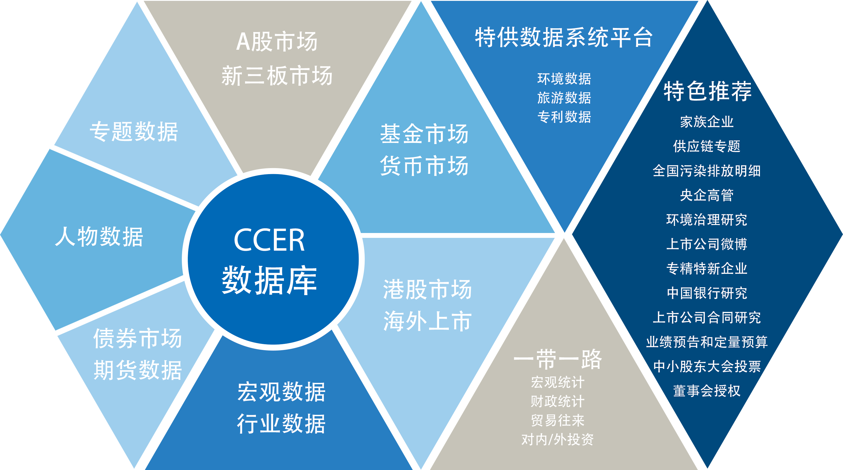 CCER经济金融数据库覆盖中国宏观、微观市场经济金融数据,遵循学术研究使用习惯,设计迎合市场需求的数据产品。目前数据库数据内容主要分成三大模块:标准数据、特供数据、一带一路。其中标准数据库分为A股市场、新三板数据(中小企业)、基金市场、债券市场、港股市场、宏观数据、货币市场、行业数据、期货数据、海外上市、人物数据、专题数据共12个版块;特供数据系统平台提供工商信息数据、工业企业数据、工业污染数据、税调数据、海关数据、专利数据;一带一路专题库由数据服务、国家概况、新闻资讯、政策环境组成;为实证研究提供高效多元的数据服务。